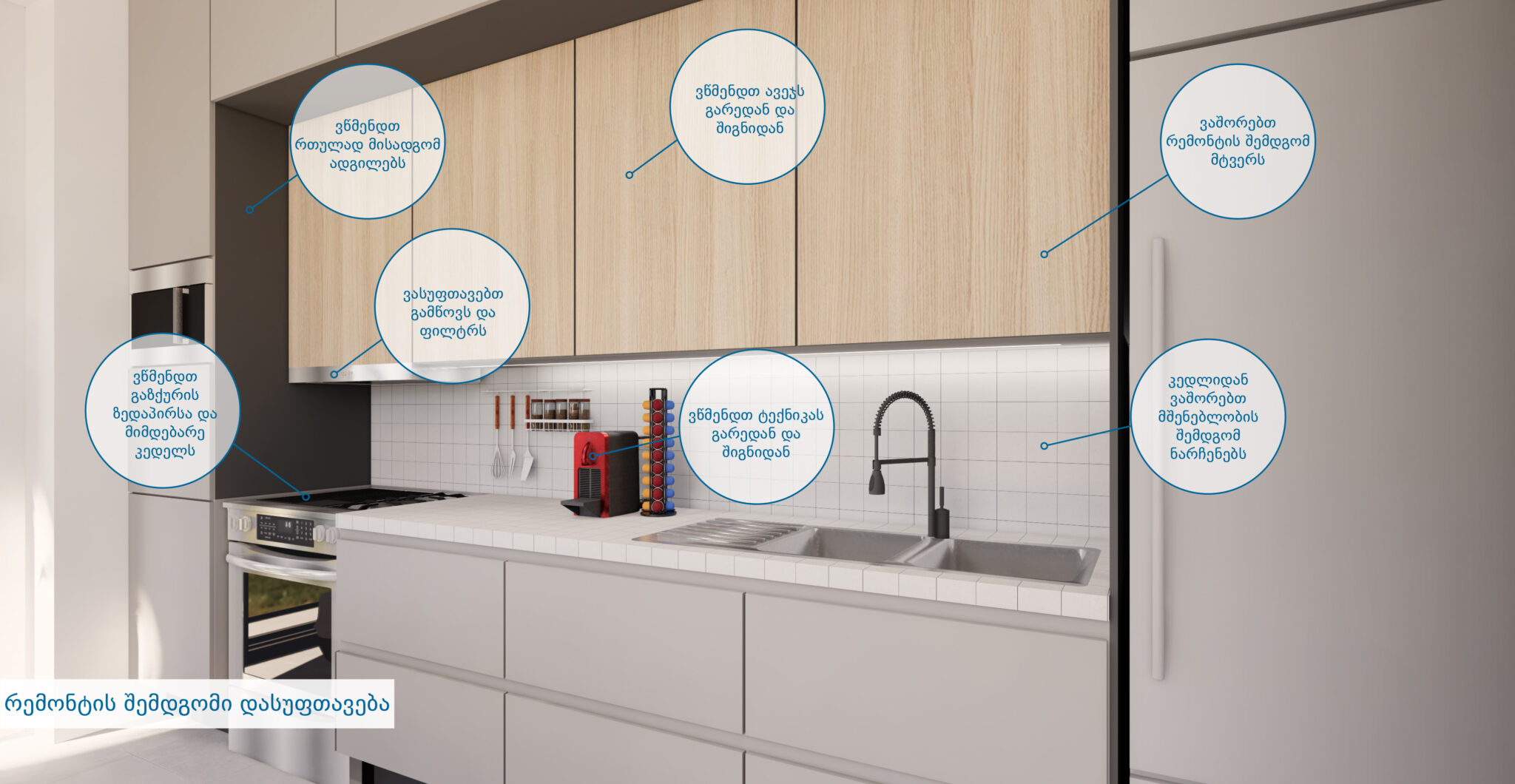 - სამზარეულოს გარნიტურის წმენდა შიგნიდან (კარადები უნდა იყოს ცარიელი)
